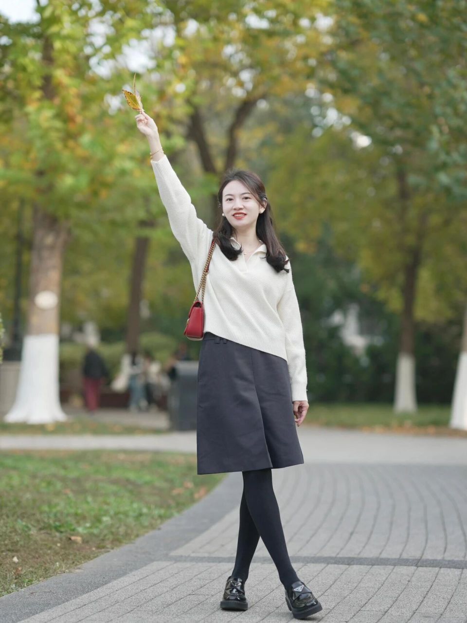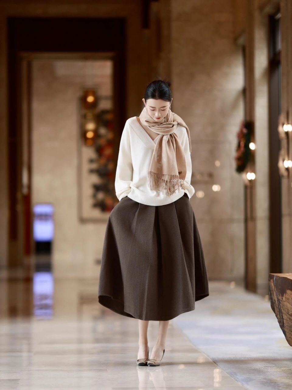 上面这一身穿搭真的很高级,用白色的毛衣搭配上大地色的散装半身裙,裙子还是高腰收腰款,这样可以很好的形成高腰线,使得身材变成三七分比例。