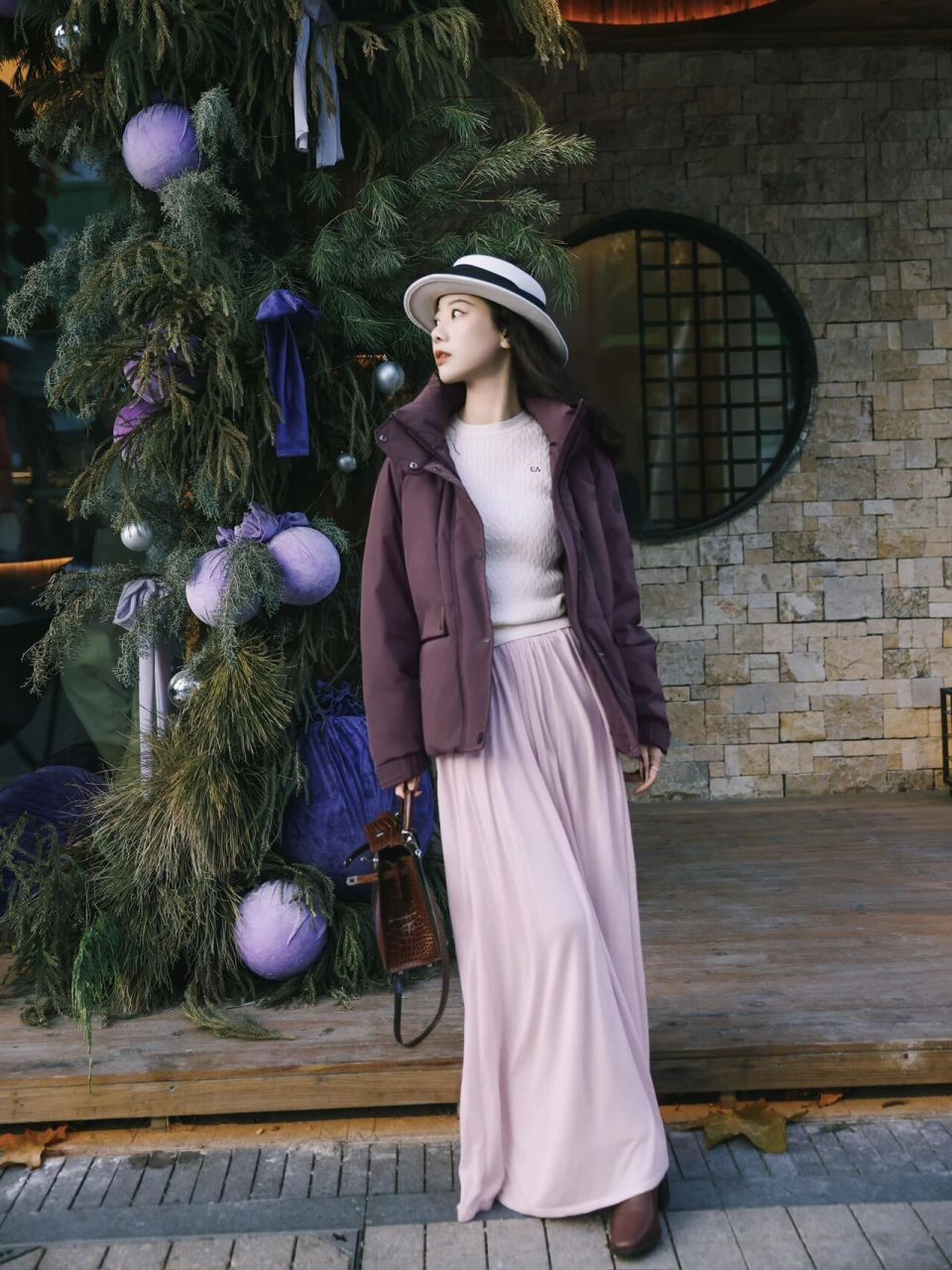 不过在这寒冷的冬季,出门的时候还是要披上一件外套才行,例如上面就用了一件紫色的羽绒服来组合搭配,和整体配色看起来很协调,同时也显得高贵时尚,最主要的是做到了时尚与保暖兼顾。