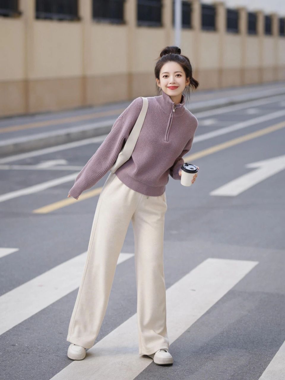 Tips②:香芋紫毛衣搭配白色直筒裤