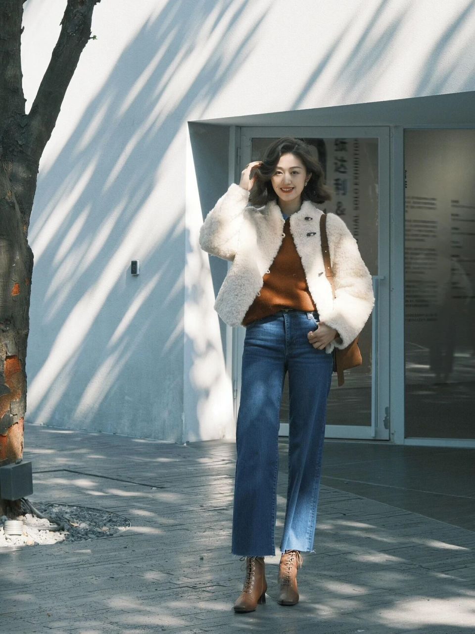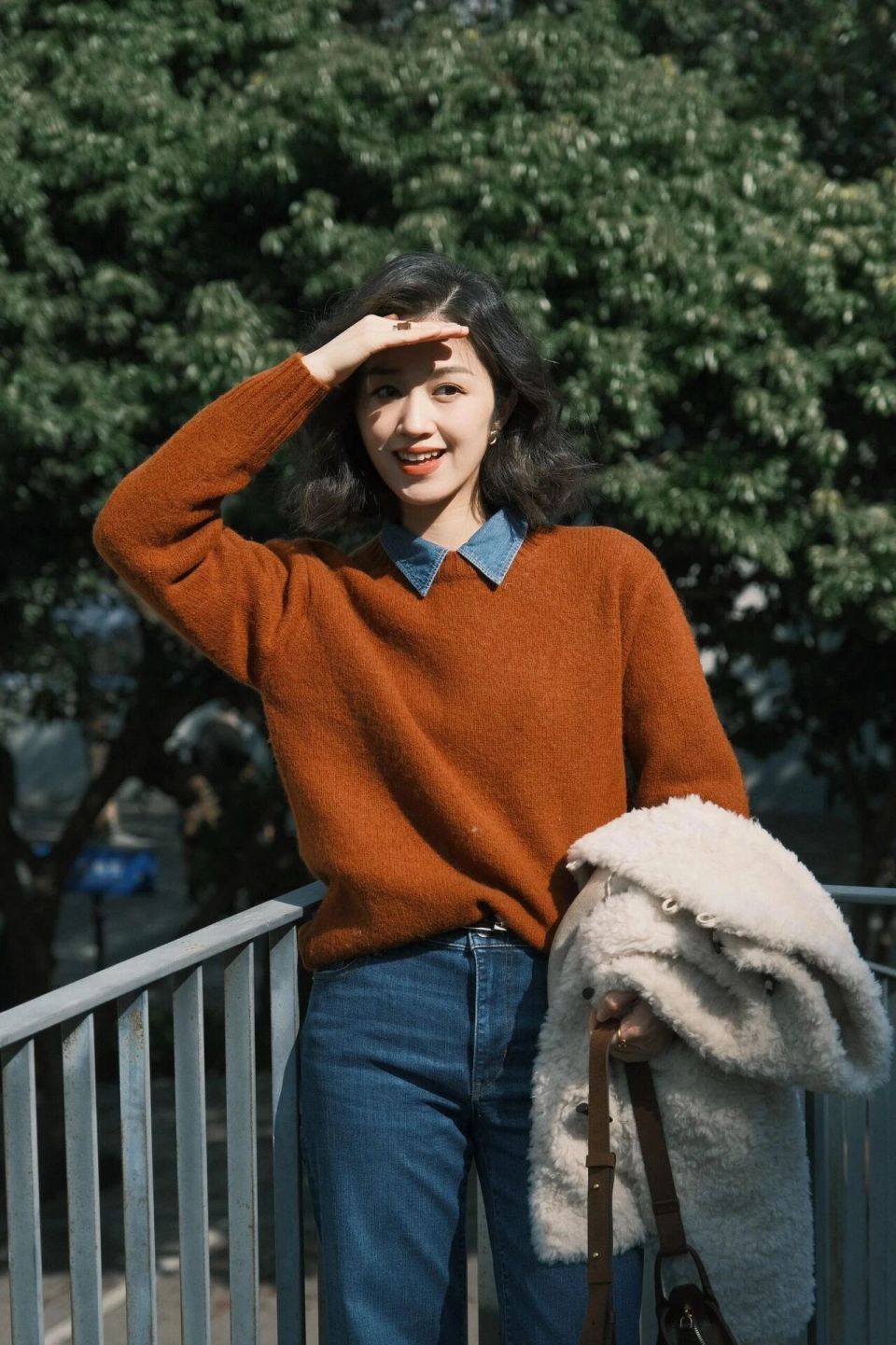你可以再加上一件白色的羊羔毛外套,这样就会更保暖。