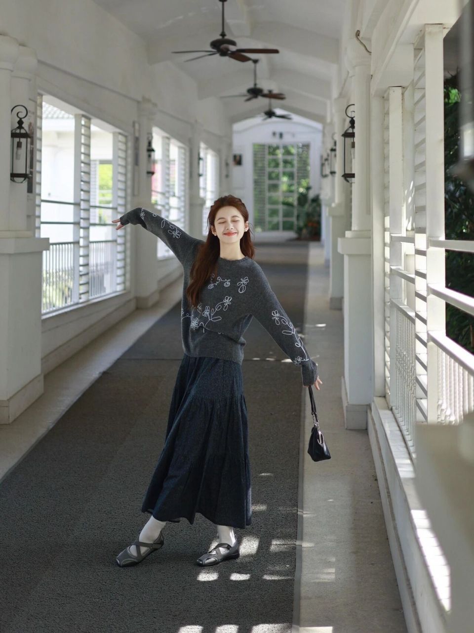 如果咱们是小个子女性,同时又想让自己的穿搭比较优雅,可以直接选择最不容易出错的灰色针织开衫,搭配上同色系的伞状半身裙,脚上穿的银灰色的玛丽珍鞋,这样的穿衣造型也属于“上短下长”的搭配方式,能使得穿搭者显高显瘦。
