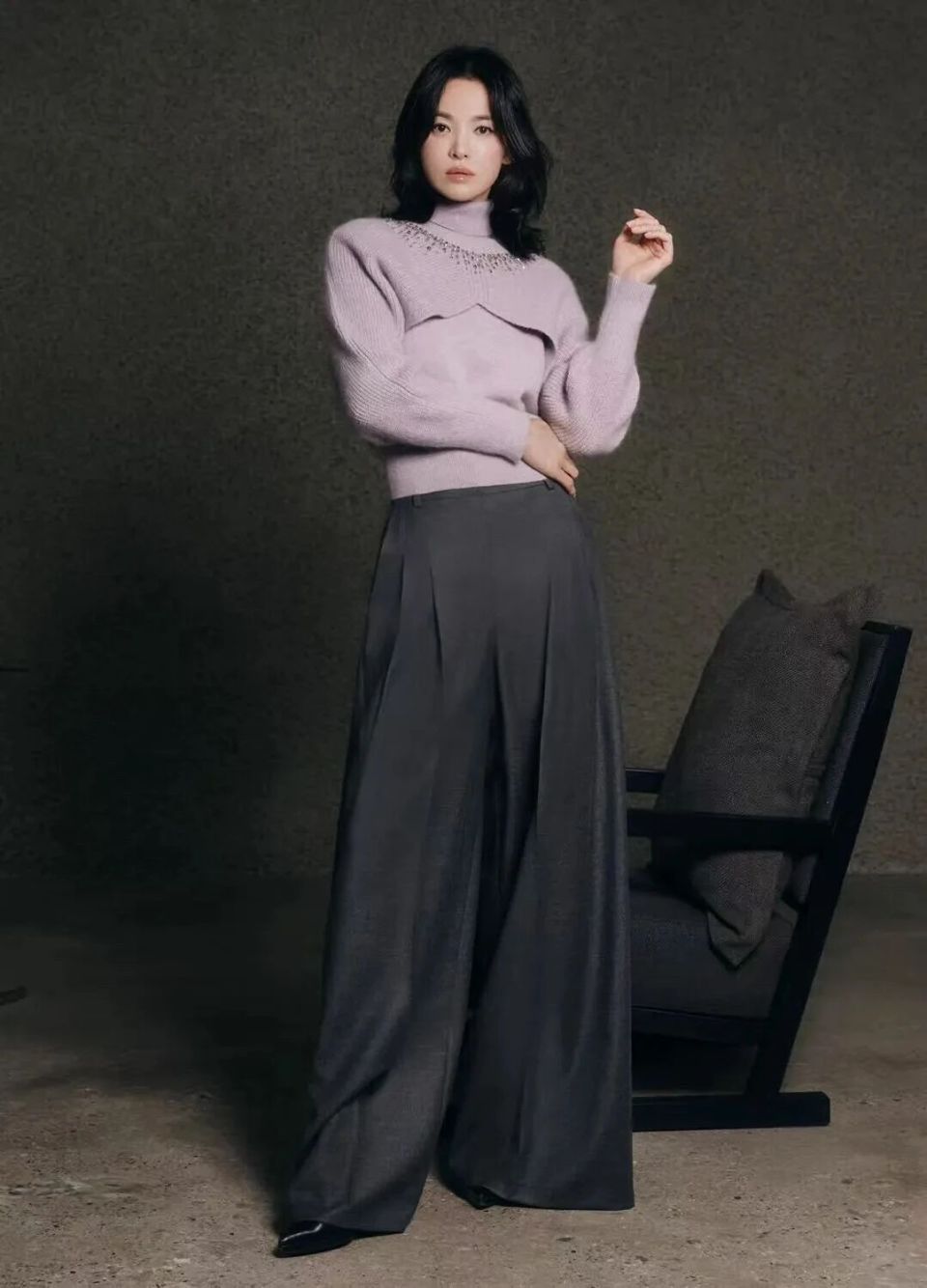同样是毛衣,不同的穿法有着不一样的气质。芋字的香芋紫的毛衣搭配深灰色的西裤阔腿,脚穿黑色尖头单鞋,这样的穿搭温柔又干练。