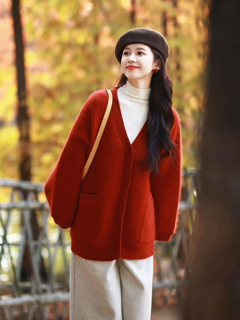 Tips①:红色毛衣开衫搭配白色裤子,超级蓬勃