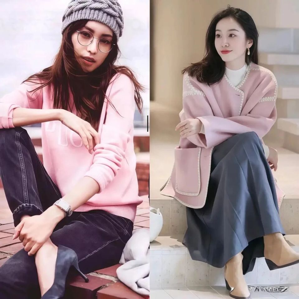 如果咱们用粉色的衣服单品来穿搭,当你的下装不同,气质也有很大的区别。用一条牛仔裤来搭配粉色的毛衣,这时候确实会比较干练。