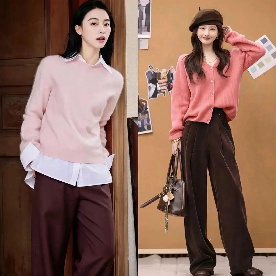 比较有质感的粉色毛衣,上身效果并没有装嫩的嫌疑,再搭配一条挺括有型的直筒西装裤,就能使得穿搭者变得很干练。