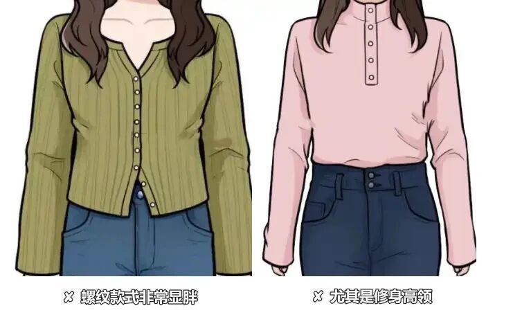 首先不能穿螺纹款式的毛衣,这种毛衣穿在身上很容易显胖。