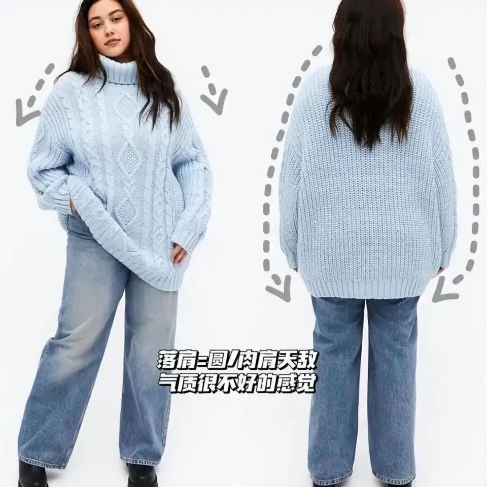 如果身材有点微胖,但是想穿毛衣,也不能选择上面这种落肩宽松的雾霾蓝毛衣,上身效果气质很不好,显得拖沓邋遢,还有点肥胖的感觉。