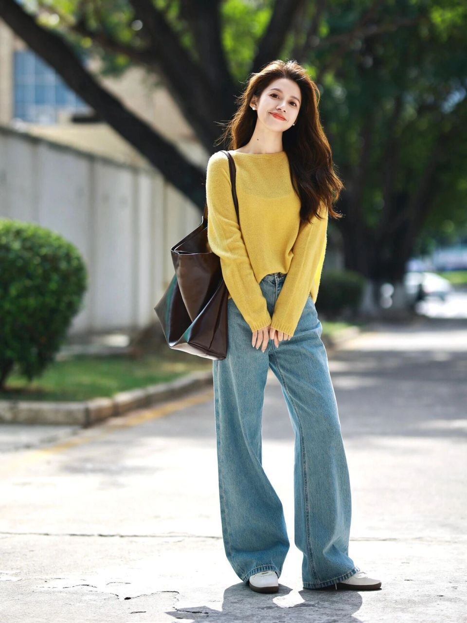 Tips②:黄色毛衣搭配牛仔直筒阔腿裤,通勤时髦