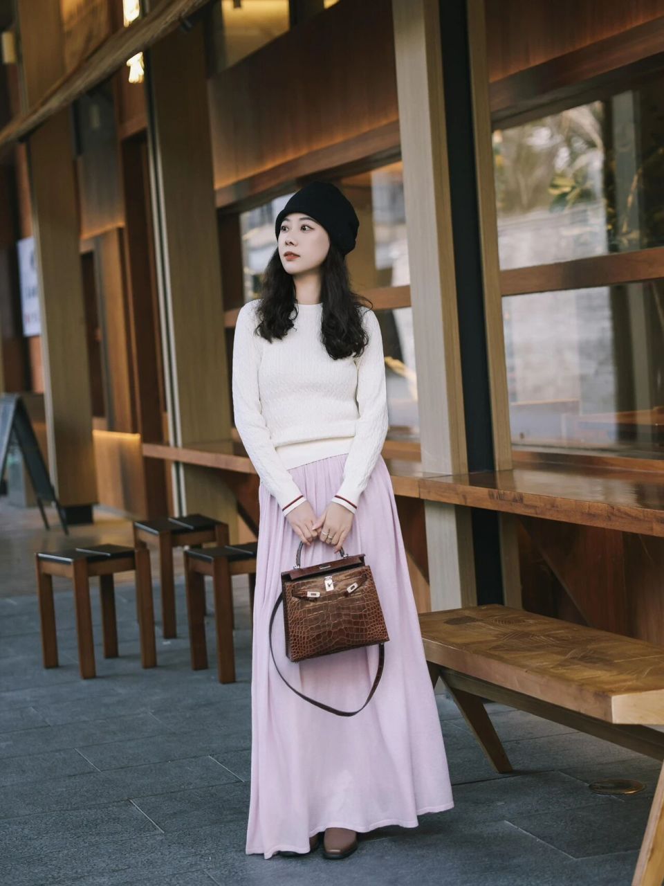 Tips③:白色毛衣搭配香芋紫半身裙,温柔优雅