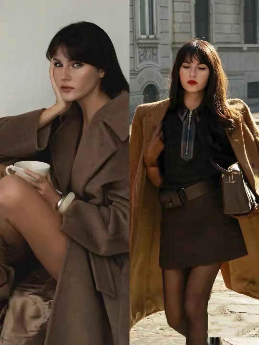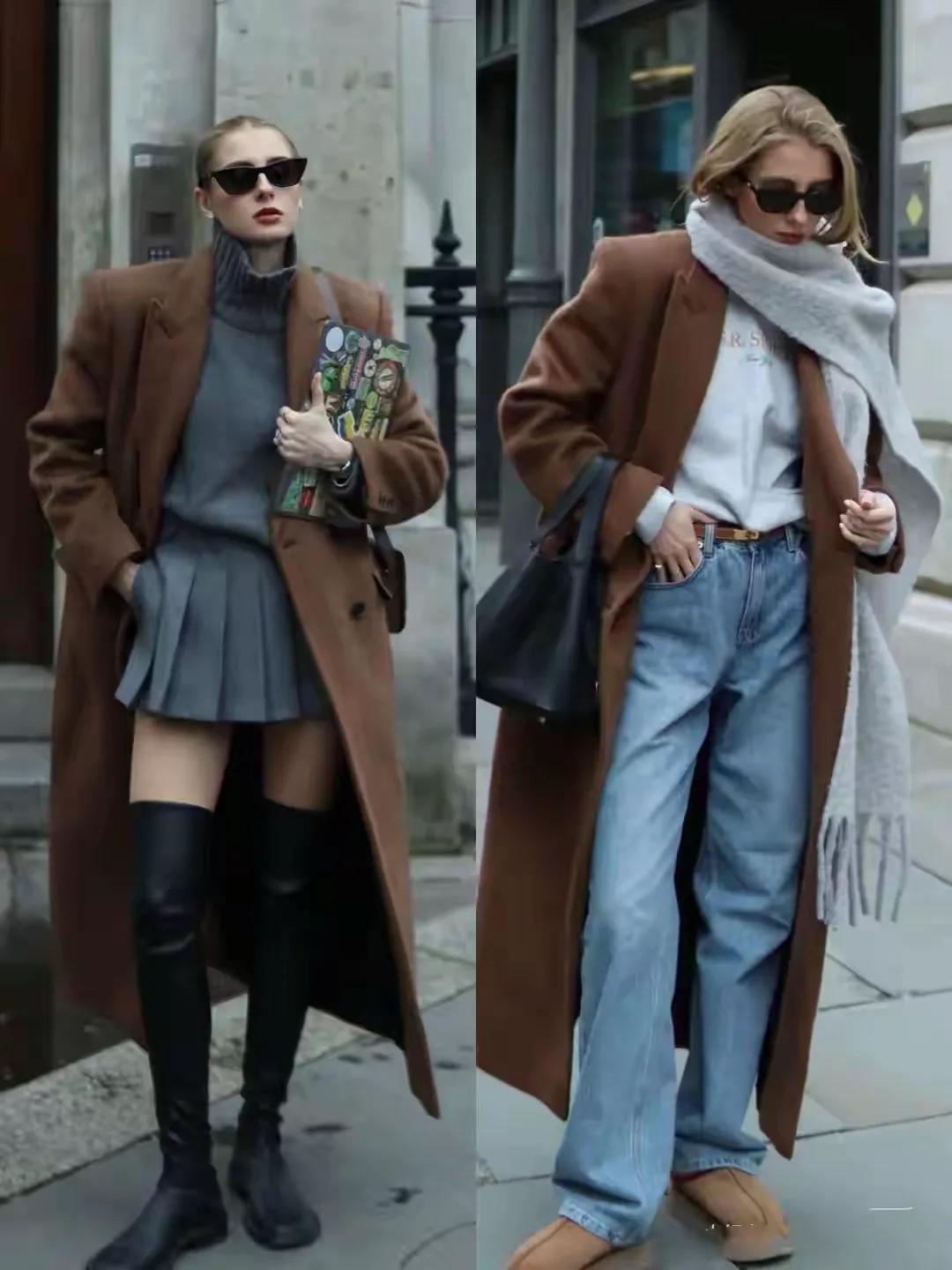 第一章节:驼色大衣怎么样才能穿出高级感,关键看搭配组合Tips①:黑色半身裙 VS 灰色西装裤