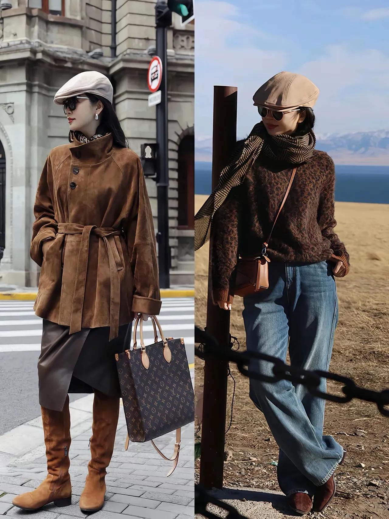 例如上图左边这套穿搭,用驼色大衣内搭黑色针织毛衣,加上蓝色的牛仔微喇叭阔腿裤,手里提的驼色的皮质小方包,这样的穿衣打扮就显得很高贵。