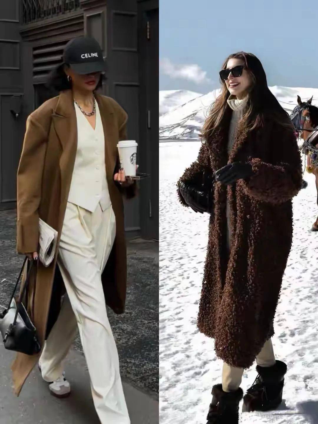 咱们就说上面这一件驼色的羊羔毛外套,超模或者是气质和气场比较强的女性穿了确实很 fashion。但是小个子女生、身材微胖的女性穿这样的羊羔毛大衣外套,根本呈现不出比较强的气质和气场。